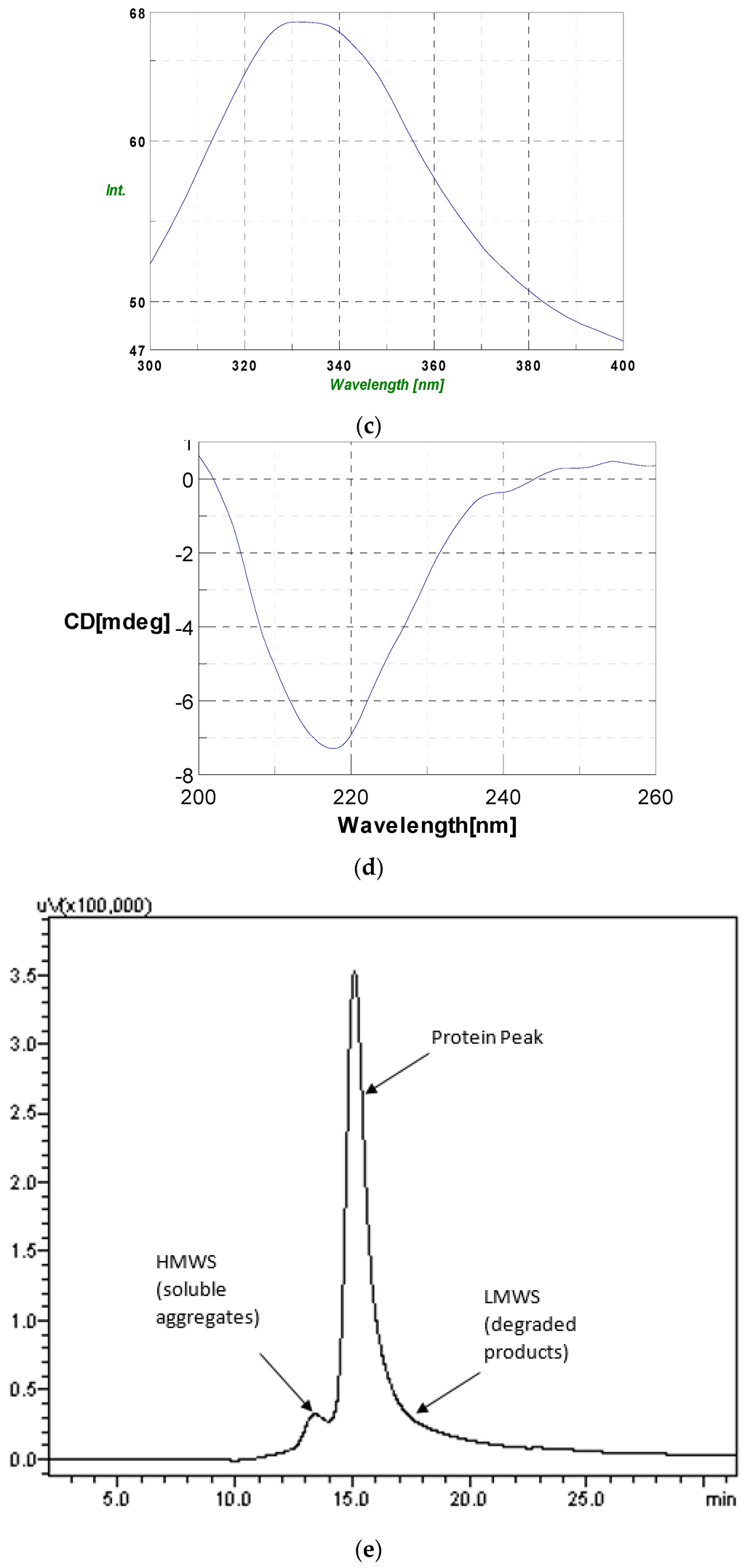 The fluorescence data indicates reasonable tertiary structure of the protein as the chromophores show strong emission at 330 nm. Both Trp and tyrosine (Tyr) have a wavelength of maximum absorption at around 280 nm, but at 295 nm, only Trp gets excited and not the weaker Tyr. Emission peak of Trp ranges from 300 to 350 nm depending on the polarity of the solvent. In Figure 5c, wavelength excitation maximum is ~330 nm, which shows good folding of the protein suggesting tryptophan moieties deeply buried within the protein without getting exposed to local environment consisting of solvent, denaturants, surfactants and presence of nearby protonated amino acid residues, thus minimizing fluorescence quenching. Overall, the fluorescence data indicate intact tertiary structure of VEGFR1(D1–D3)-Fc.