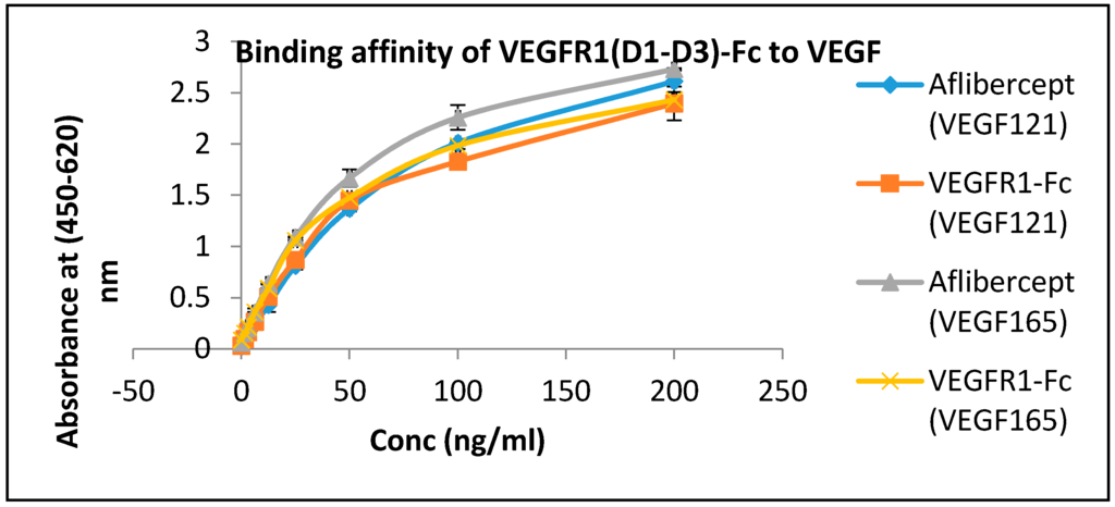 The affinity of VEGFR1(D1–D3)-Fc protein towards its ligands, VEGF165 and VEGF121 was checked using ELISA and compared to the affinity of another fusion protein, VEGF TrapR1R2 towards the same ligands (Figure 6). It was observed that VEGFR1(D1–D3)-Fc exhibits a strong affinity towards its natural ligands, and its affinity towards both the VEGF ligands was almost comparable to that of a known decoy receptor trap, aflibercept.