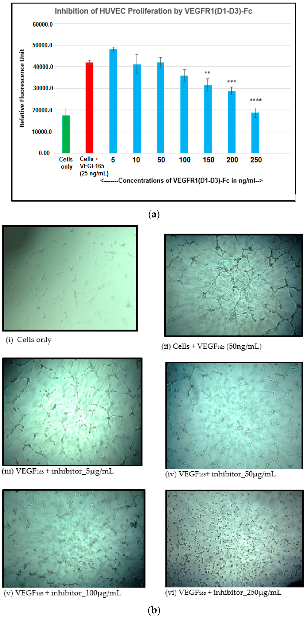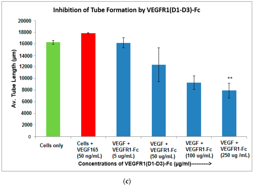 VEGFR1(D1–D3)-Fc protein was used to check its inhibitory activity on network formation by endothelial cells. Images were taken with a digital camera fitted to an inverted microscope under 5× magnification (Figure 7b,c).