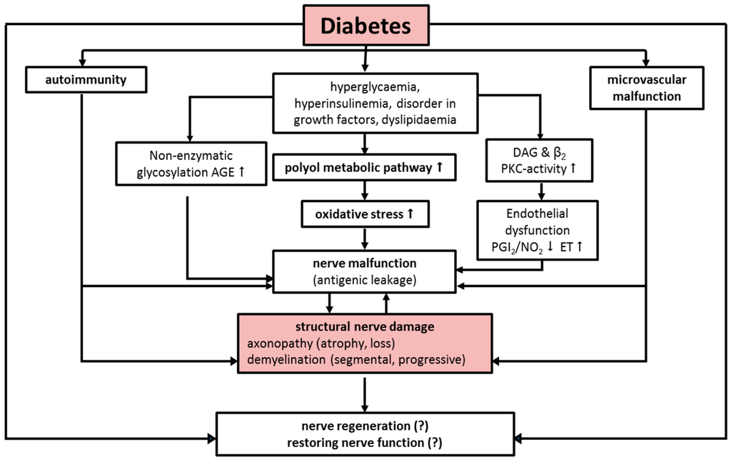 Different pathogenetic concepts are discussed: mainly malfunction of polyol and myo inositol metabolism, reduction of Na/K-ATPase, endoneural microvascular deficits with consecutive ischemia, formation of oxygen radicals, neurotrophic disorder (IGF-I, NGF), defective axonal transport and non-enzymatic glycosylation of neuronal structural and transport proteins (Figure 1) [,,,].