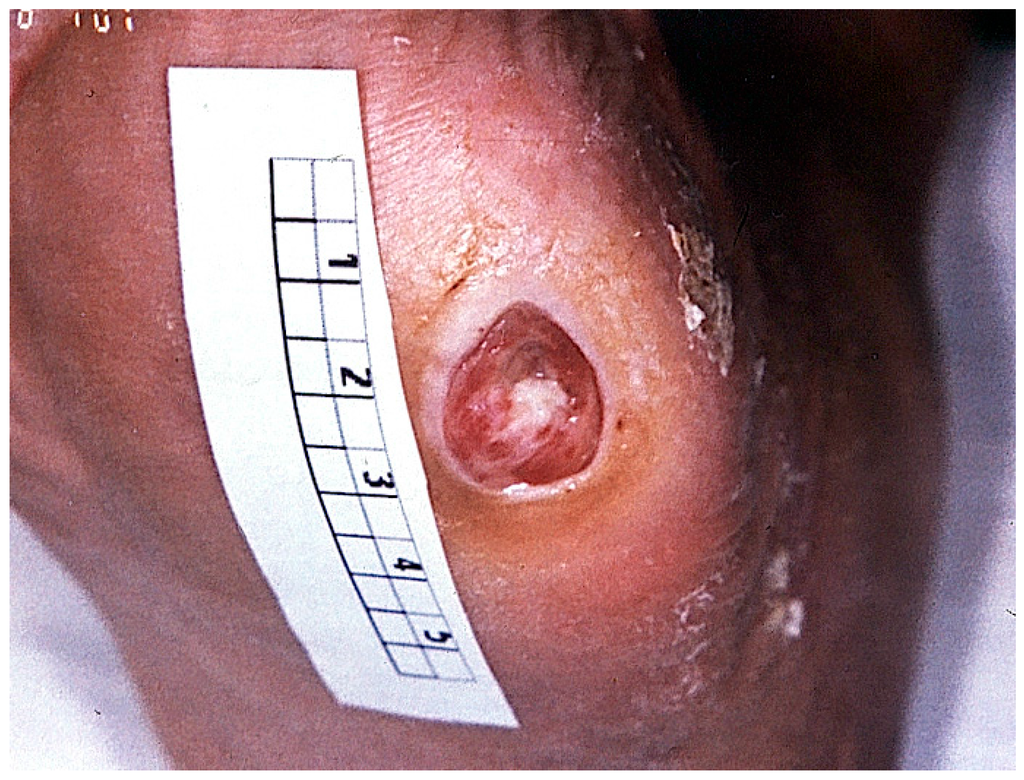 Ulcers are found at typical predisposed locations (areas of high pressure load e.g., metatarsal I), and are of circular shape surrounded by hyperkeratotic borders that have developed from high pressure load. Despite the often bland exterior ulcer impression, large extension of depth at probing or a subclinical coinfection of the surrounding tissue is commonly found (Figure 2).