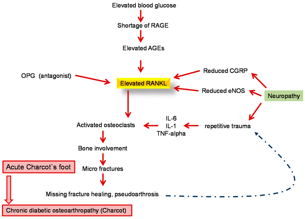 Pathophysiology of diabetic osteoarthropathy underlying the central role of the RANKL-OPG system in the development of destructive bone alterations. RANKL = receptor activator of nuclear factor-kappa B ligand; AGE = advanced glycation end product; CGRP = calcitonin gene-related peptide; eNOS = endothelial nitric oxide synthase; IL = interleukin; OPG = osteoprotegerin; RAGE = receptor for advanced glycation end products; TNF= tumor necrosis factor.