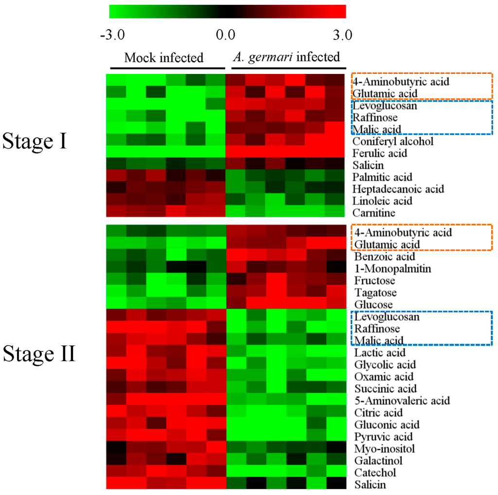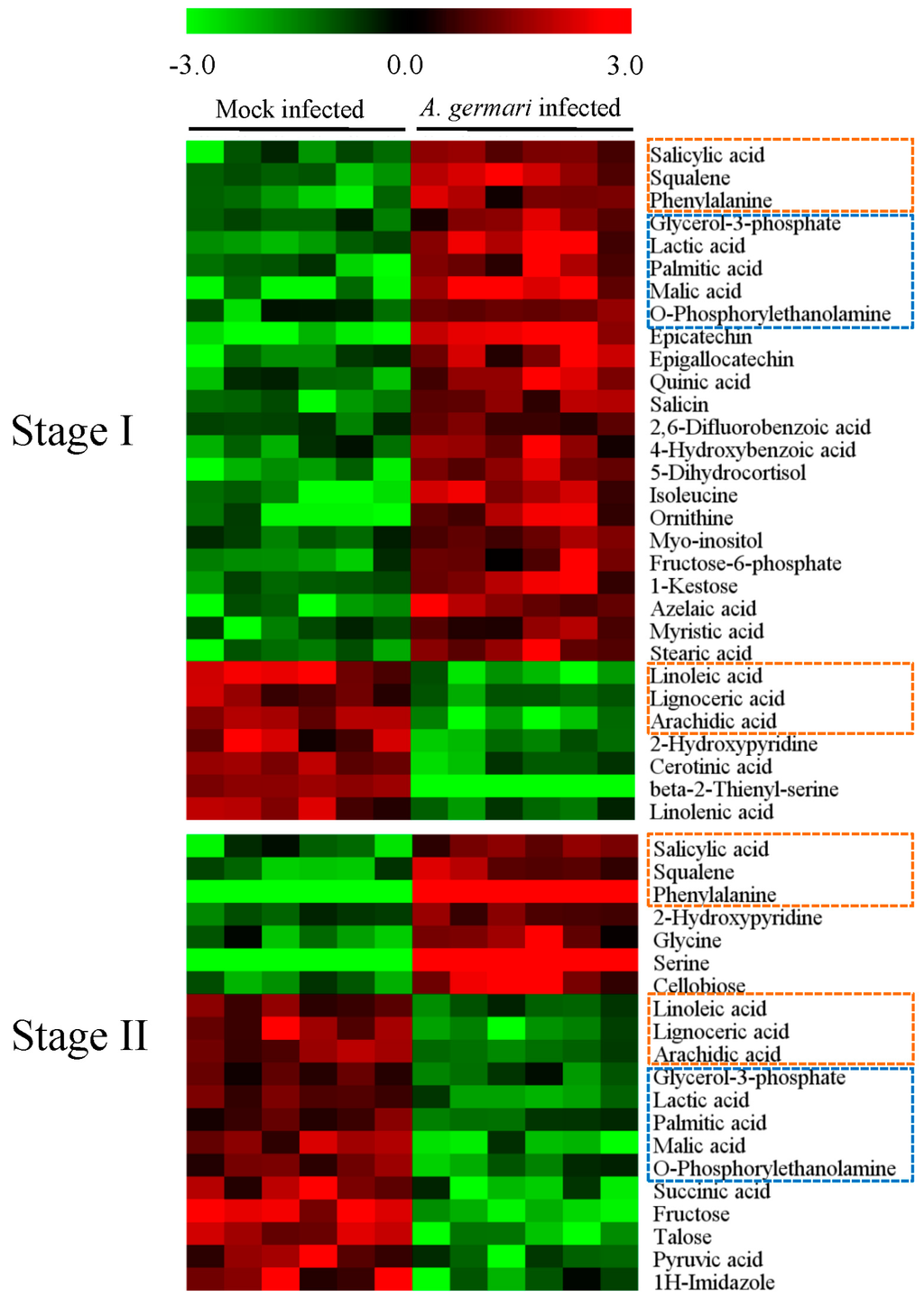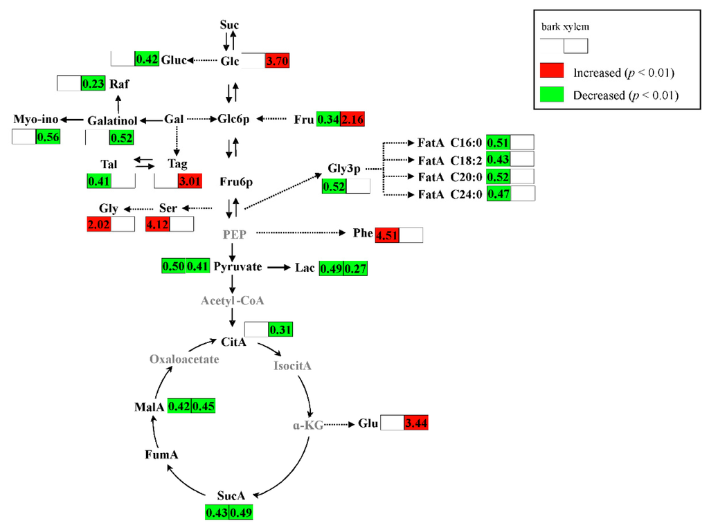 2.2. Metabolic Alteration in Bark and Xylem Tissues Following Infection of A. germari