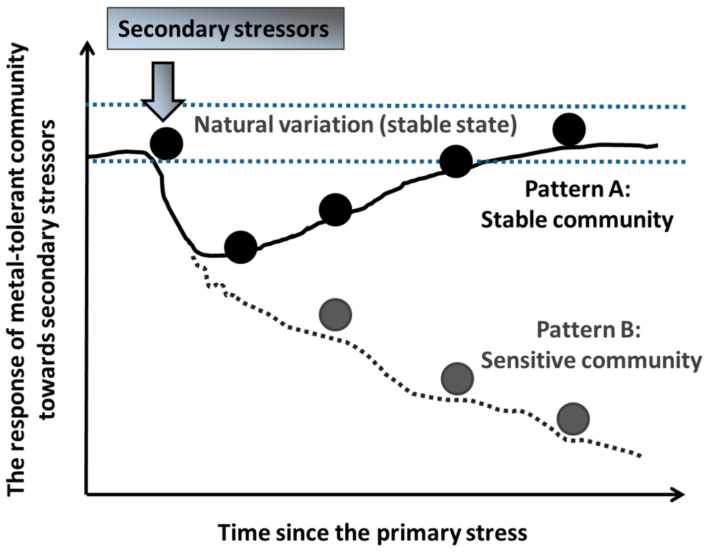 Because metal contamination is highly persistent, metal-polluted ecosystems are inherently different from those disturbed by natural, short-lived factors, such as, e.g., flooding [109]. Duration and specificity of a stressor are important factors shaping microbial response towards secondary stressors. We argue that the degree to which a community is resistant or resilient depends on the initial microbial community [18,110], the nature and level of the secondary stressor [18,34,110], and historical environmental conditions (that is, long-term exposure to toxic levels of metals) [18,35,110]. Disturbances caused by stressors having a specific mode of action may only alter certain groups of microorganisms, whereas stressors with non-specific modes of action can target a wide range of microorganisms. The effect of a transient disturbance is different from that of long-term disturbance (e.g., metal pollution), since inhibited species usually recover quickly from transient disturbance, so that the community can persist in an equilibrium state (resilience). This has been documented in several studies where some soils showed resistance and/or resilience to transient heat, but not to persistent copper addition [111,112,113,114,115,116].