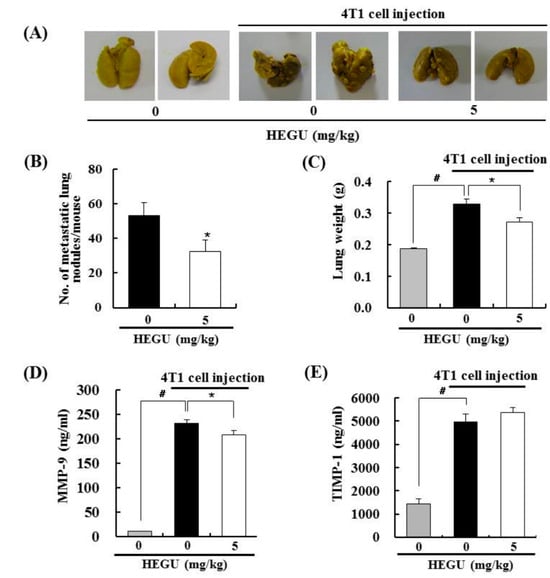 2.2. HEGU in Drinking Water Inhibits Lung Metastasis in the 4T1 Mouse Tumor Model