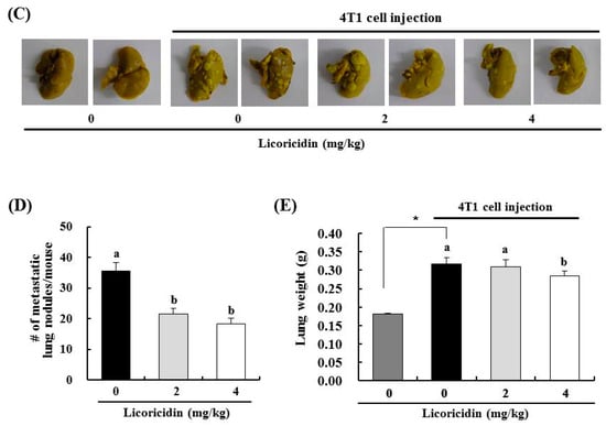 2.3. Licoricidin Inhibits Lung Metastasis in the 4T1 Mouse Tumor Model