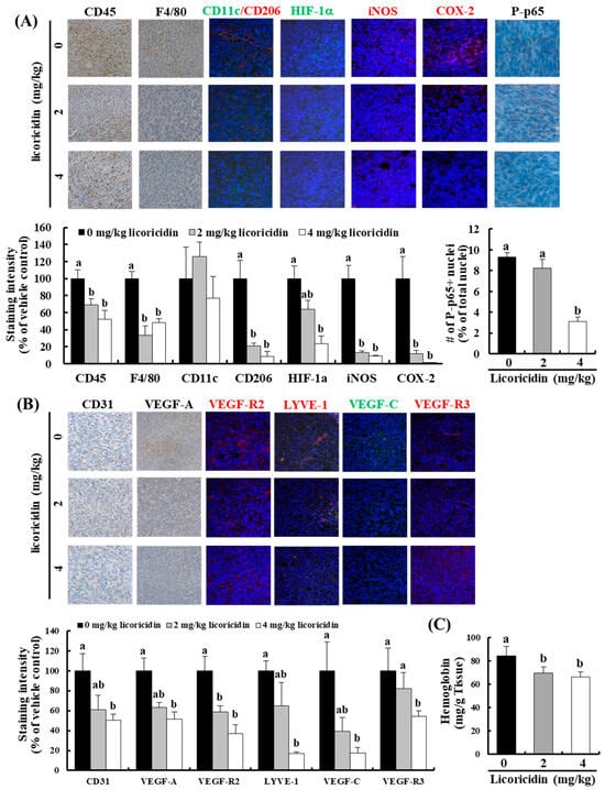 2.4. Licoricidin Decreases the Infiltration of Macrophages, Especially M2 Cells, and the Expression of Proteins Related to Inflammation, Angiogenesis, and Lymphangiogenesis in 4T1 Mammary Tumor Tissues in BALB/c Mice