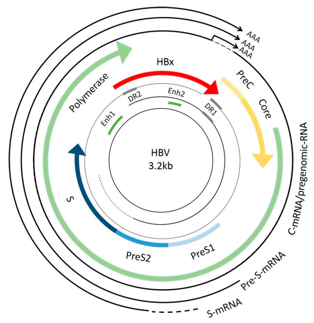 HBV, with a length of 3.2 kb, is a member of the hepadnaviridae family. It is an enveloped, partially double-stranded DNA virus that replicates its genome by reverse transcription. There are four overlapping open reading frames (ORFs) which encode seven proteins (pre-S1, pre-S2, S, pre-C, C, viral polymerase, HBx protein) and four regulatory elements (enhancer II/basal core promoter, preS1 promoter, preS2/S promoter, and enhancer I/X promoter) (Figure 1) [,].