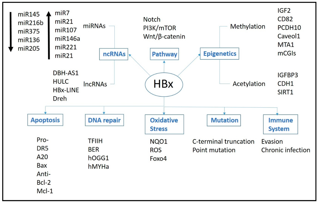 HBx has been reported to modulate the expression and activities of numerous genes, as well as epigenetic molecules (e.g., miRNAs and lncRNAs) and events (e.g., methylation and Acetylation), leading to the deregulation of various pathways and function (Figure 2 and Table 1) as discussed below.