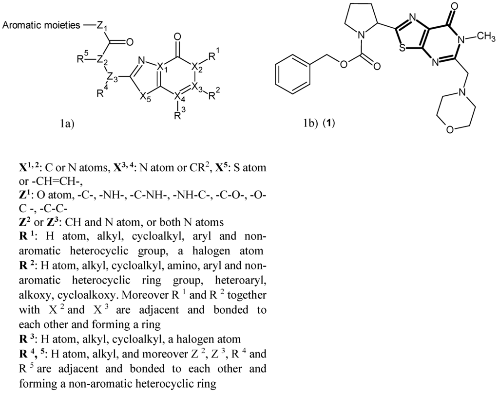 A series of heterocyclic compounds were synthesized in 2015, which represented considerable inhibitory activity against hKAT-2. The general structure of these compounds is shown in Figure 1a. From the several possibilities for the heterocyclic rings provided in Figure 1a, the optimum ring system is (1,3)thiazolo(5,4-d)pyrimidin-7(6H)-one (bold in Figure 1b). The most potent inhibitor (1) is shown in Figure 1b with a reported IC50 of 0.61 μM []. Compound (1) has six free rotatable bonds, which presumably allow the compound to be accommodated in the binding site more advantageously, with its nine hydrogen bond acceptors sites enhancing the binding affinity in the interaction pocket, compared to other designed inhibitors.