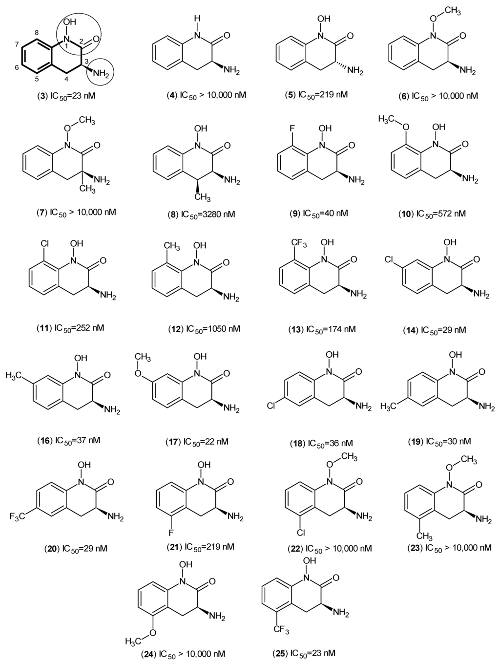The Pfizer team observed that the presence of a hydroxyl group at position 1 plays a key role in the activity of this series of compounds, and (6) confirmed that this free hydroxyl moiety is necessary because it can play a role as both a hydrogen bond acceptor and a donor. By looking at the biological data of (3) and (5), the stereoselectivity role of the amino group at position 3 was revealed. At position 3, the free amino group (which points upward, S configuration) is the most suitable moiety, and Compounds (7) and (8) indicated that no other small groups close to the amino moiety can be tolerated in the binding pocket because of the clash with the external aldimine linkage situated between the free amino group and PLP. The effects of different groups on the aromatic ring are discussed here due to the extensive investigations performed on the substitutions on the non-aromatic ring of the template. By looking at Compounds (9–12) and (22–25), it can be concluded that only small groups, like fluorine, are allowed at positions 5 and 8. Meanwhile, the biological assay results revealed that hKAT-2 has a large pocket, which not only provided enough room for substituents at positions 6 and 7, but one suitable for different sizes to be accommodated. To draw conclusions about the impact of altering the electronic properties of the moieties, more studies are required.