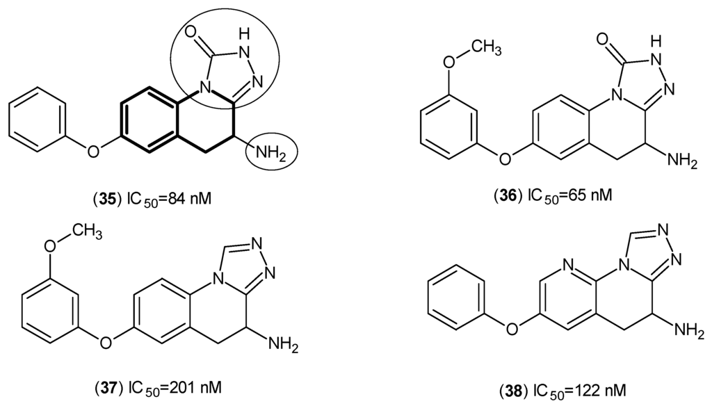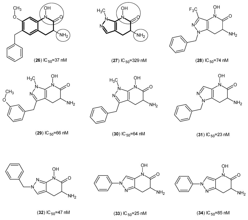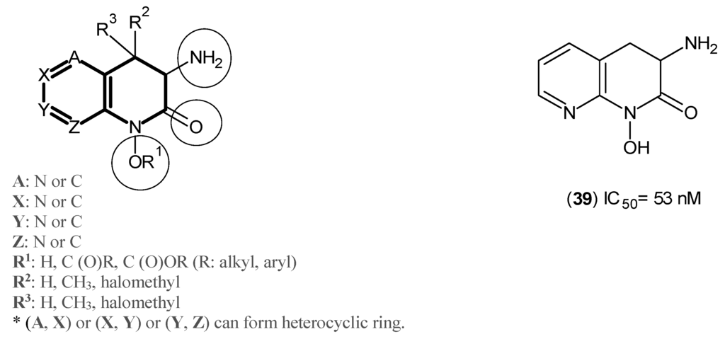 Furthermore, from yet another comprehensive study on the same series of inhibitors from Pfizer, several compounds sharing the same nucleus depicted in Figure 6 were evaluated against hKAT-2, and from this, Compound (39) was determined to be the most potent with an IC50 of 53 nM [].