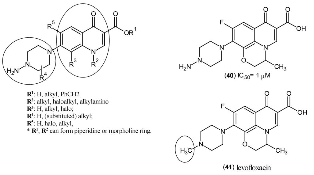 Structural nuclei of hKAT-2 inhibitors and structures of BFF-122 (40) and levofloxacin (41). The essential structural elements are indicated by circles (piperazine and heterocyclic rings). A circle on (41) highlights the only difference between BFF-122 and levofloxacin, where there is a methyl group.