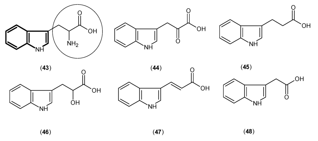 As tryptophan (43) is the main precursor of kynurenine in the catabolic pathway, tryptophan and five other chemicals (Figure 9), which share the 1H-indole core and similar side chains to tryptophan, were used in a relatively basic approach and their inhibitory activity was evaluated against KAT-1. Some of these studies predate some of the KAT-2 studies already shown. Among them 3-indolepropionic acid (45) and ±-indole-3-lactic acid (46) represented the best inhibitory effects with values of IC50 140 and 220 μM, respectively [].