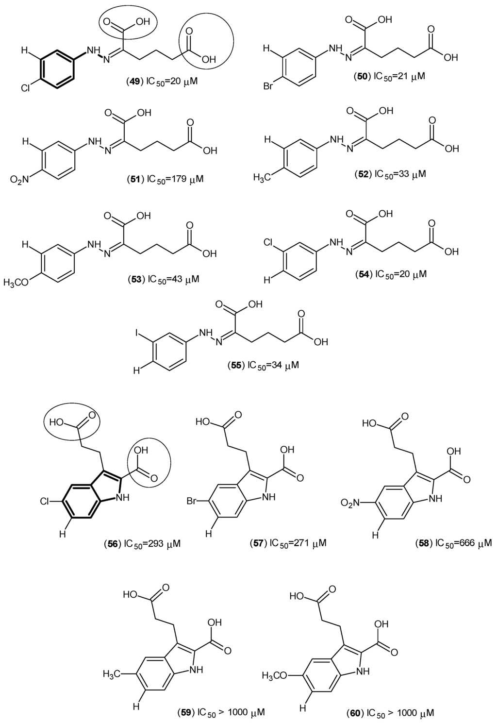 Structures of 1H-Indole-3-propanoic acid and hexanoic acid derivatives as hKAT-1 inhibitors. The main pharmacophore of these is in bold, and the essential structural elements are indicated by circles (carboxylic groups).