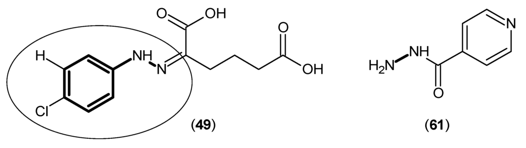 One more aspect about Compound (49) is the existence of the phenylhydrazine nucleus. From much earlier work on possible antituberculosis agents and from an in vivo evaluation, it was reported that isonicotinic acid hydrazide (61) (Figure 11), also showed very promising inhibitory activity against KATs [].