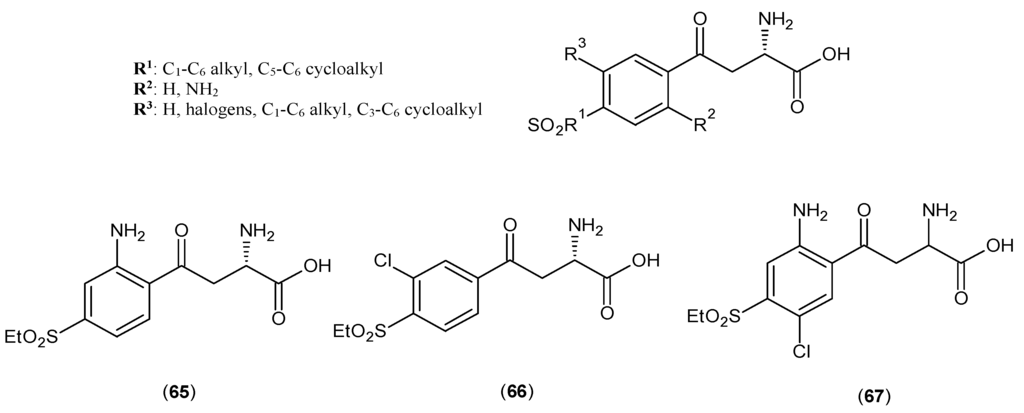 A study of 4-sulfonyl-substituted benzoylalanine derivatives considered as potential KATs inhibitors was reported in 2006 []. The core structure of these series of inhibitors is depicted in Figure 13. The inhibition bioassay was done on rat liver extractions only, and three compounds (65–67) showed promising IC50 values, and their ranges were between 2 and 25 μM.