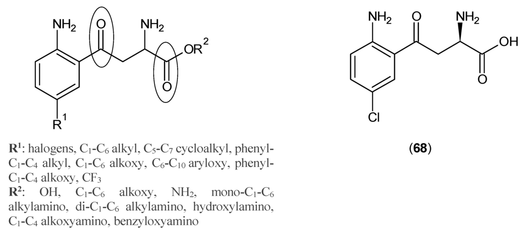 In 1995, Schwarcz et al. [] pursued a study of kynurenine analogues as KAT inhibitors. The nucleus they adopted for their study is depicted in Figure 14. Compound (68) showed around 80% inhibition of rat KAT-2 at 1000 μM []. The same team obtained IC50 of 5.4 μM for Compound (68) by evaluating its inhibition against rat KAT-2 in brain, which was almost five-times higher than the affinity of KYN to the enzyme. Moreover, they found that by omitting the keto group from the side chain, the inhibitory effect is reduced to almost negligible [].