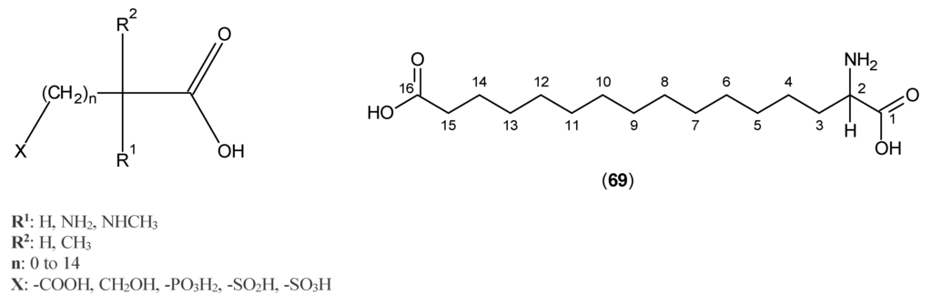Dicarboxylic acid derivatives were also examined for their inhibitory activity against KATs. The general structural formula of these compounds is shown in Figure 15, and among them, (±)-2-amino-1,6-hexadecanedioic acid, Compound (69), presented the highest activity with the value of IC50 6.5 μM [].