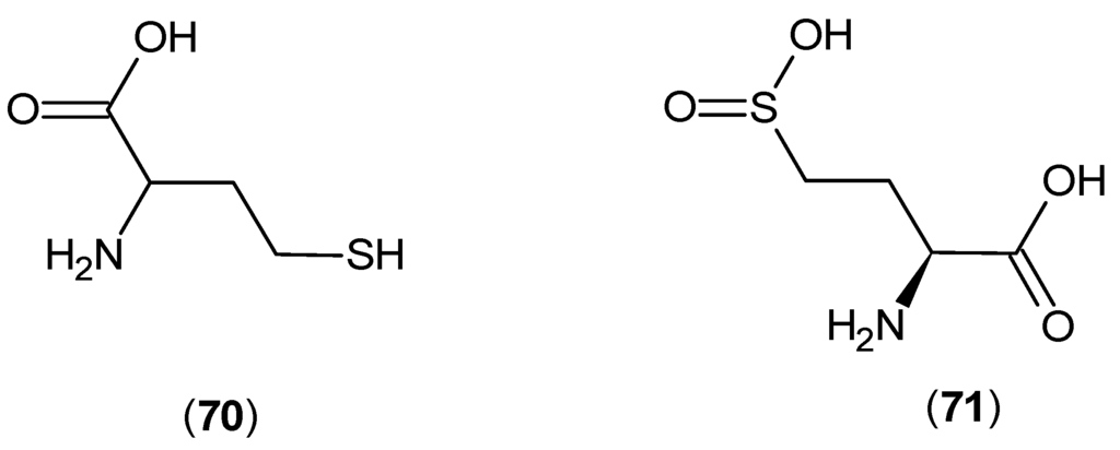 In biochemical studies, KAT-1 and 2 were found to be expressed in the cytoplasm of bovine aortic endothelial cells, and the production of KYNA was monitored in the presence of ±-homocysteine (70) and l-homocysteine sulfinic acid (71) (shown in Figure 16); the IC50 results of 54 and 100 μM, respectively [], were encouraging.
