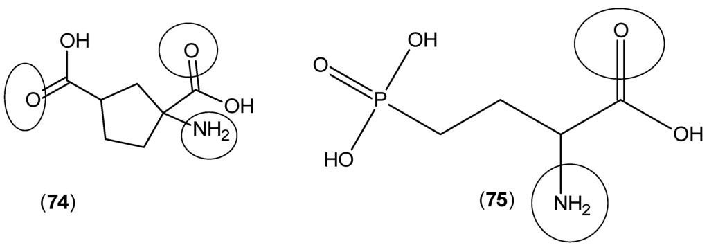 Structures of 1-aminocyclopentane-1,3-dicarboxylic acid (74) and 2-amino-4-phosphonobutanoic acid (75). The keto and amino groups, which have a predominant role in the interaction with KAT active site residues, are highlighted by circles.