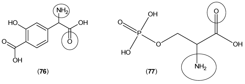 Structures of 4-(amino(carboxy)methyl)-2-hydroxybenzoic acid (76) and 2-amino-3-(phosphonooxy)propanoic acid (77). The keto and amino groups, which have a predominant role in the interaction with KAT active site residues, are highlighted by circles.