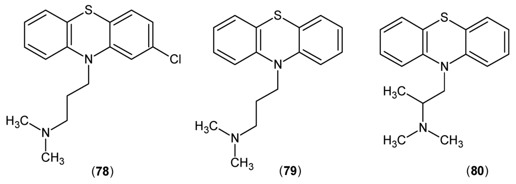 In 1982, the effects of several known antipsychotic drugs were examined with the KATs. In vivo results revealed that KYNA production had a decrease after the inhibition of KAT activity by chlorpromazine (78), promazine (79) and promethazine (80), depicted in Figure 21. In vitro tests indicated that these compounds did not have any effects on the KATs [].