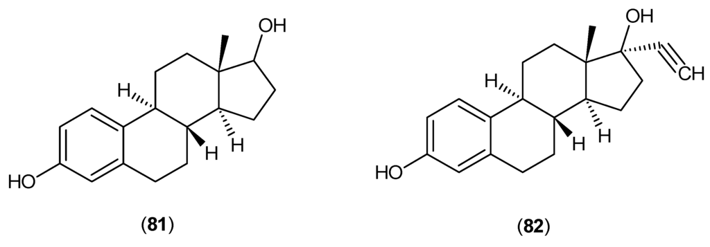 Between 1959 and 1976, a small number of studies were done examining the effects of estradiol analogues on the activity of the kynurenine aminotransferase isozymes. One study showed that β-estradiol (81) and ethynylestradiol (82), shown in Figure 22, could inhibit the activity of male mice KATs [].