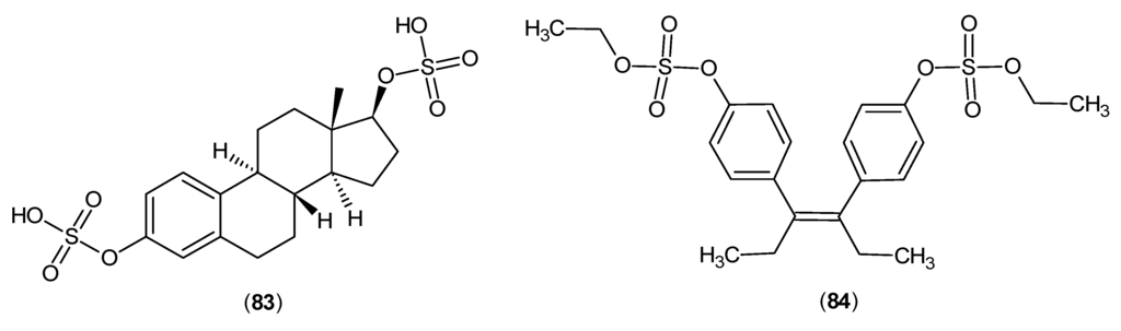 In another study, the results demonstrated that conjugated estrogens affected the production of kynurenic and xanthurenic acid levels, two known products of KAT isozymes []. Moreover, estradiol disulphate (83) and diethylstilbestrol disulphate (84) (Figure 23) are able to inhibit KATs. It was proposed that these compounds are competitive and reversible inhibitors as their inhibitory effects are dependent on the concentration of the cofactor, PLP [].