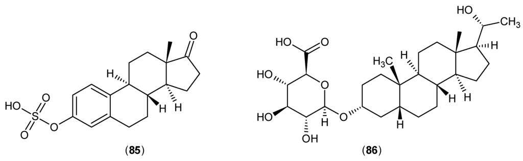 These results were consistent with the outcomes of research that followed on rat KAT activities in the presence of estradiol disulphate and diethylstilbestrol disulphate. Furthermore, the effects of estrone sulphate (85) and pregnanediol glucuronide (86) (Figure 24) were evaluated against rat KATs, and these two could inhibit this enzyme family in a similar manner at a slightly higher concentration in comparison with (83) and (84). The PLP was not implicated with a direct role in the mechanism of their inhibitory effects, as it was proposed that they act as reversible inhibitors and their actions are probably due to the interaction with other parts of the catalytic active site [].