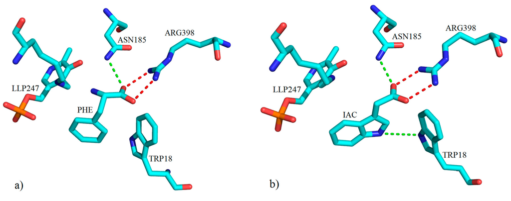 Depiction of the key molecular interactions between amino acid residues of the active site of hKAT-1 with (a) PHE (PDB code: 1W7M) and (b) IAC (PDB code: 3FVU) in the presence of LLP247 (PLP + LYS247). Both ligands form a hydrogen bond with ASN185 via their keto groups (green broken lines). A salt bridge interaction between ARG398 and the carboxylate moiety of both ligands is shown with red broken lines. All three-dimensional figures prepared using PyMOL [].