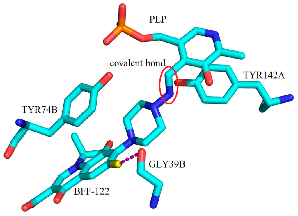 In 2010, a crystal structure with BFF-122 (40) was reported in complex with hKAT-2 (PDB Entry 2XH1) along with the report of it as one the most potent hKAT-2 inhibitors []. Close analysis revealed that BFF-122 made a permanent covalent bond to PLP, the cofactor through the Schiff base reaction. This external aldimine linkage irreversibly deactivates the enzyme and so is a permanent end to the enzymatic activity. In the active site, the aromatic ring of TYR74 is observed to have a π–π interaction with the quinoline core of BFF-122, and also, GLY39 showed an electrostatic interaction with the fluorine moiety of BFF-122 (Figure 27).