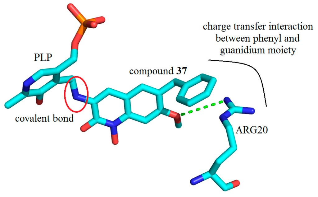 It is obvious that the pocket of hKAT-2 can accommodate a bulky inhibitor very well, and this property of the hKAT-2 pocket is, in large part, due to the flexible loop, ARG20-SER32, which acts as an entrance gate; and the significant displacement it can undertake accommodates additional bulk. Similarly, the structure of hKAT-2 in complex with Compound (37) (PDB Entry 4GE9) showed a role for ARG20 specifically. The methoxy group at position 6 can form a hydrogen bond with ARG20, and due to this interaction, the guanidinium group in ARG20 also has a charge transfer interaction with the phenyl ring at position 7 (Figure 28). It is considered that with both the conformational change and guanidinium interaction, the free binding energy stability and potency are enhanced considerably [].