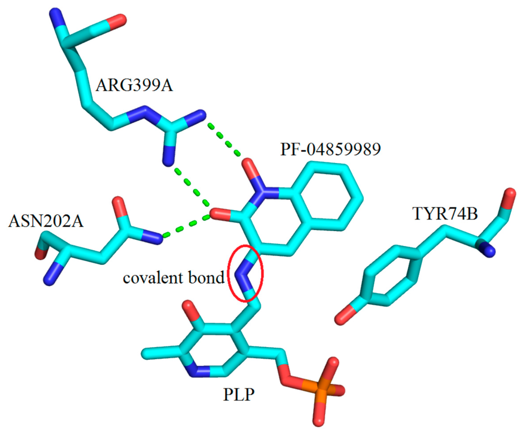 To continue, after the arrival of the potent hKAT-2 inhibitor, PF-04859989 (3), the crystal structure of this compound in complex with hKAT-2 revealed the same mechanism of action as with BFF-122. PF-04859989 made an irreversible covalent bond to PLP and permanently inactivated the enzyme. TYR233 and ASN202 both form hydrogen bonds with the PLP component of the complex (PF-04859989 + PLP), and ASP230 and TYR195 are involved in interactions with the pyridine ring of the PLP. The hydroxyl and keto moieties on the quinoline core of PF-04859989 make two key hydrogen bonds (as acceptor sites) with ASN202 and ARG399. Similar to the BFF-122 active site pocket, TYR74 again showed hydrophobic contact with PF-04859989 (Figure 29). It is worth commenting that by consideration of the hydrogen bond interactions with the core of the inhibitors for both the KAT-1 and 2 active sites, it can be concluded that the role of ASN185, ARG398 in hKAT-1 and the role of ASN202, ARG399 in hKAT-2 are the same. Therefore, the design of the KAT inhibitors should impose the presence of the keto groups in the nucleus.