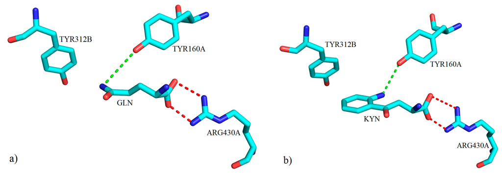 The three-dimensional representation of key molecular interactions between amino acid residues of the active site of mKAT-3 (a) with GLN (PDB code: 3E2Y) and (b) with KYN (PDB code: 3E2Z). Both ligands form a hydrogen bond with TYR160A via their amino groups (green broken lines). Salt bridge interactions between the ARG430A residue and the carboxylate moiety for both ligands are shown with red broken lines.
