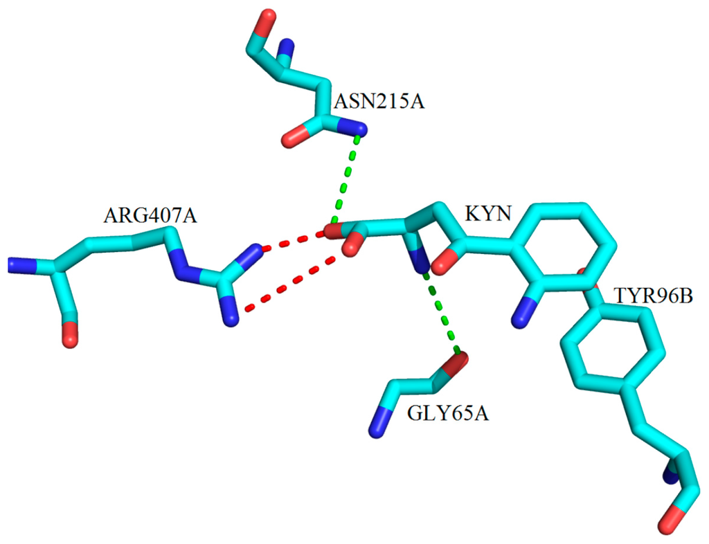 The three-dimensional depiction of key molecular interactions between amino acid residues of the active site of mKAT-4 with KYN (PDB code: 3PD6). KYN forms hydrogen bonds with GLY65A, TYR160A and ASN215A via its amino and keto groups, (green broken lines). Salt bridge interactions between the ARG407A and the carboxylate moiety of KYN are shown with red broken lines.