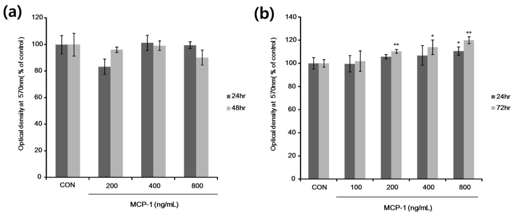 2.3. Cell Viability and Proliferation after MCP-1 Treatment in Normal Human Keratinocytes (NHKs) and NHMs