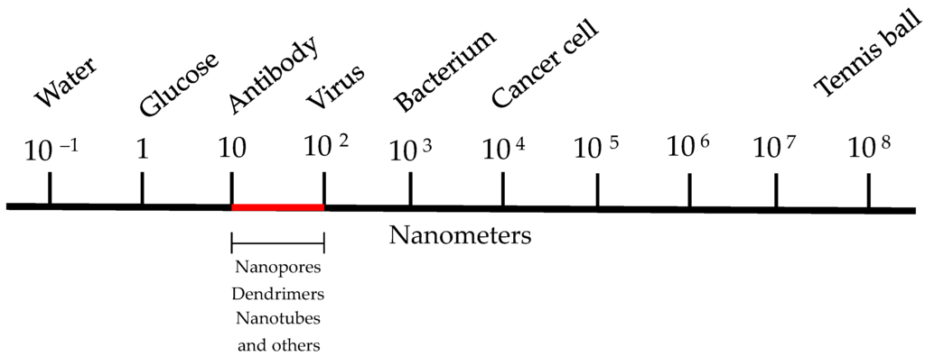 Nanotechnology, in a general way, is the study of the control of matter in the size range of 100 nm or smaller. As a comparison, a hydrogen atom is 0.1 nm in diameter, a lysosome is between 200 and 500 nm, an Escherichia coli bacterium is about 2 μm in length and most eukaryotic cells are between 8 and 30 μm in diameter or larger. The magnitude of proteins ranges between 3 and 90 nm; therefore, many enzymes, signaling molecules and receptors are in the nanoscale range []. Since most biological processes occur at the nanoscale, nanoparticulate technology has a promising future to develop novel preventive, diagnostic and therapeutic agents, such as bioactive peptides. Figure 2 shows the diagrammatic representation of the size range of materials used in nanotechnology.