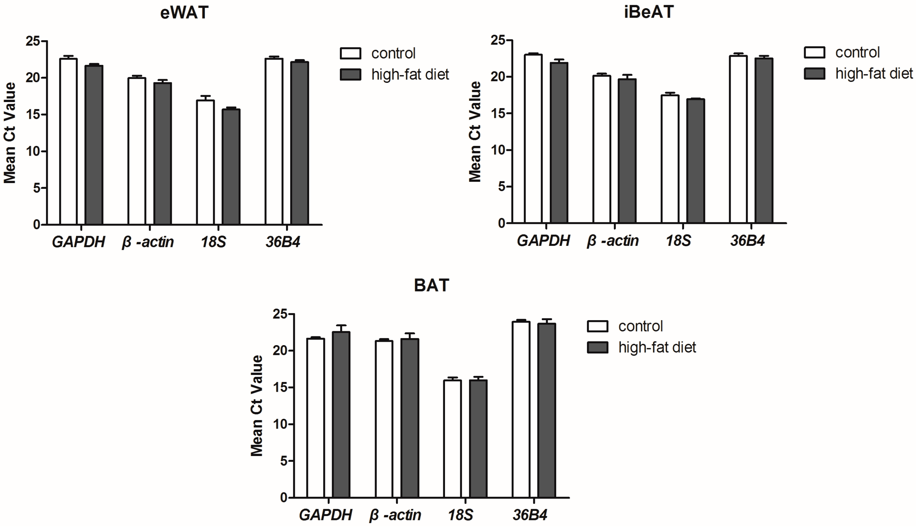 Expression levels of the reference genes in different types of adipose tissues between control and high-fat diet groups (mean ± SEM, n = 6). GAPDH: Glyceraldehyde-3-phosphate dehydrogenase; 36B4: acidic ribosomal phosphoprotein P0; eWAT: epididymal white adipose tissue; iBeAT: inguinal beige adipose tissues; BAT: brown adipose tissue.