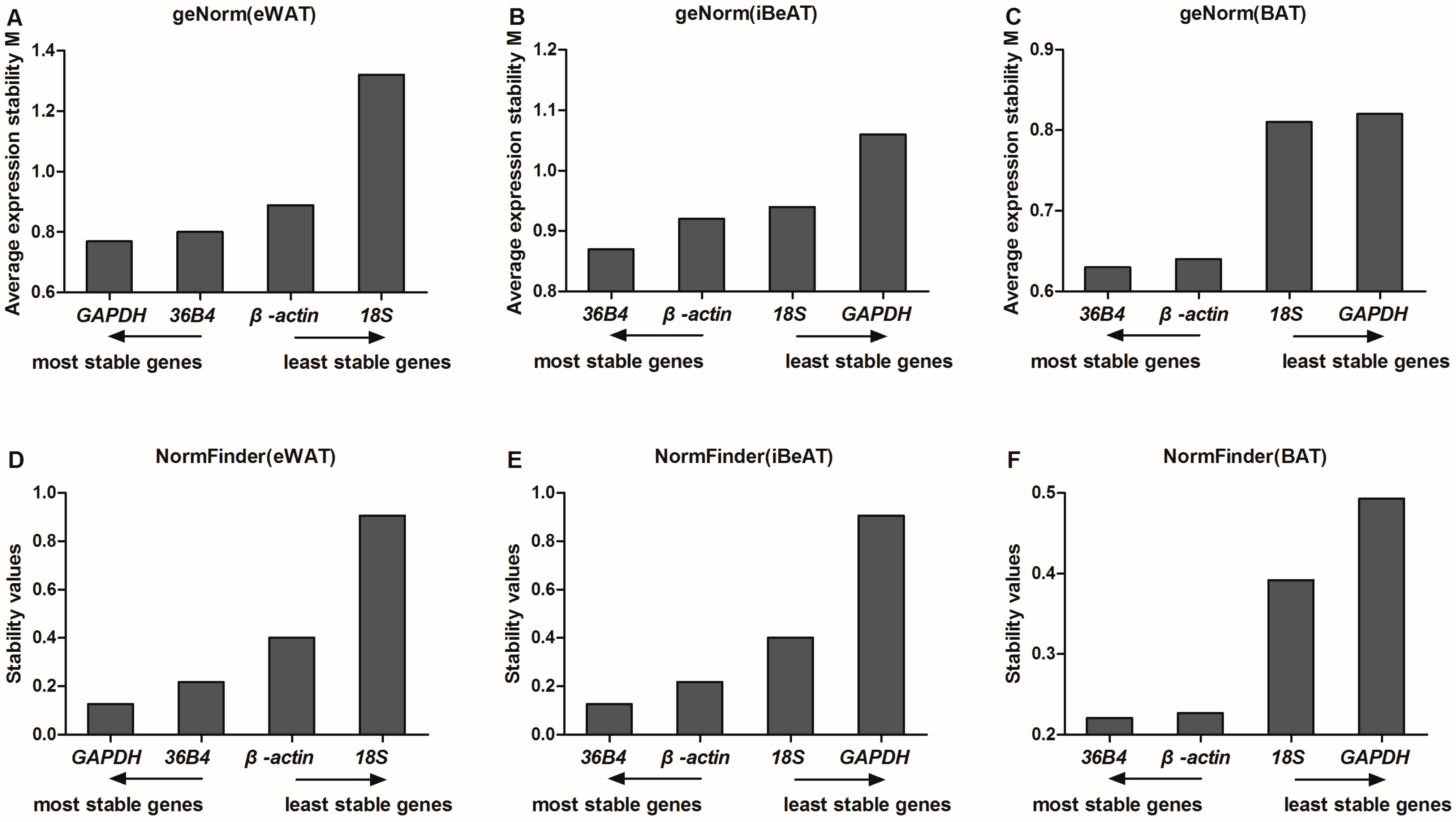 Combining all of the various software tested, MIQE guidelines and experimental verification, 36B4 and GAPDH were recommended as the optimal combination of reference genes for eWAT, and 36B4 and β-actin were found to be the optimal combination of reference genes for both iBeAT and BAT.