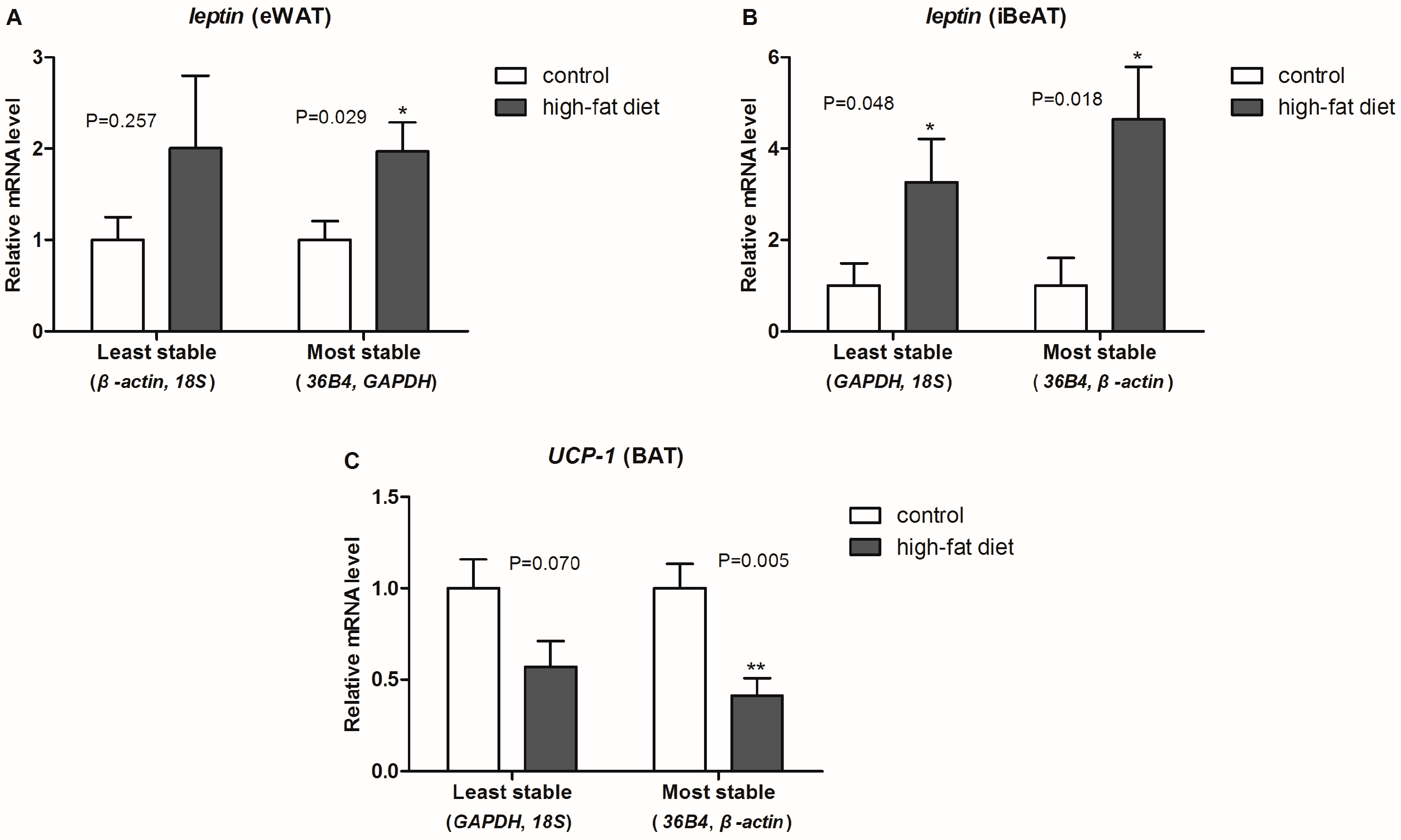 To evaluate the different results from the three algorithms systematically, a comprehensive ranking of each reference gene was calculated. Results show that GAPDH was the most stable reference gene in eWAT, but it had the highest variability in both iBeAT and BAT. In addition, 36B4 was a highly stable gene in each type of adipose tissue, even though the results from the geNorm and NormFinder analyses had a tiny disparity with GAPDH in eWAT. For a realistic study of obesity, more than one type of adipose tissue should be considered. Based on new research, “browning” of WAT will become a new strategy for obesity treatment [4,29]. Therefore, considering the variety of experimental subjects and practicability, a relatively universal reference gene among each type of adipose tissue should be used. According to our study, 36B4 is the universal reference gene in adipose tissue. In accordance with the MIQE guidelines, however, the use of multiple reference genes for normalization in qRT-PCR were proposed. We recommend 36B4 and GAPDH as the best combination of reference genes for eWAT, and 36B4 and β-actin as the most suitable reference genes for both iBeAT and BAT. To further validate our assumptions in an actual experiment, we used either the combination of most or the least stable reference gene to normalize same target genes (e.g., leptin and UCP-1). As shown in Figure 4, expected results and statistical significance were obtained by normalizing with the two most stable reference genes. This result totally confirmed our assumptions.