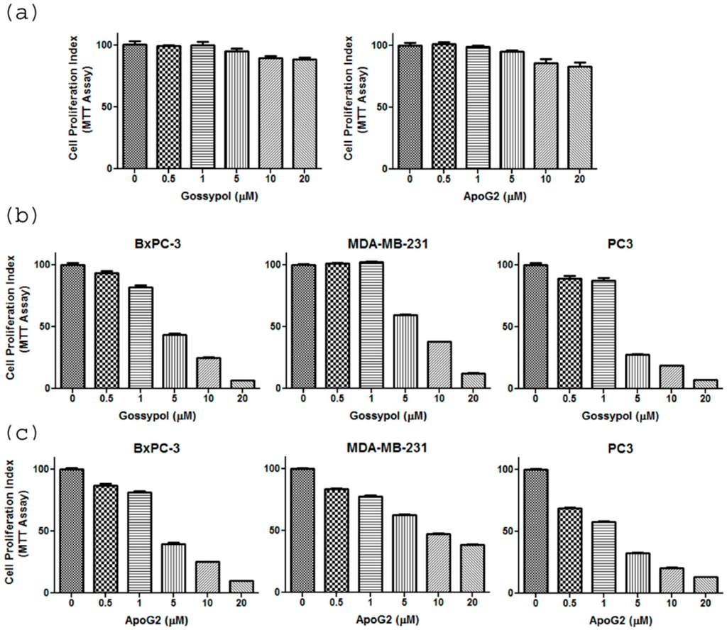 (a) The cell proliferation of normal breast epithelial cells (MCF10A) in presence of gossypol and ApoG2 was detected using MTT (3-(4,5-dimethylthiazol-2-yl)-2,5-diphenyltetrazolium bromide) assay. MCF10A cell were incubated with increasing concentration of gossypol/ApoG2, as indicated, for 72 h. Similarly, the cell proliferation of pancreatic cancer cell line, BxPC3; breast cancer cell line, MDA-MB-231; and prostate cancer cell line, PC3; in presence of increasing concentrations of (b) gossypol and (c) apogossypolone, as indicated, was detected using MTT assay. The cells were incubated for 72 h. MTT assay was performed as described in the Materials and Methods. All results are present as percentage of control (±SEM) of three independent experiments.