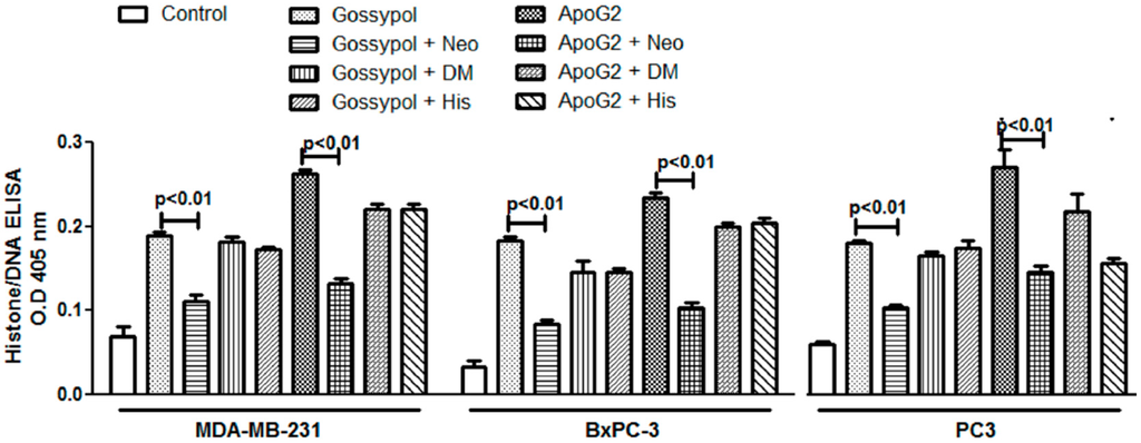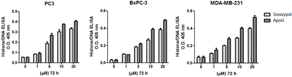 The Cell Death Detection ELISA Kit (Roche, Palo Alto, CA, USA) was used to detect apoptosis in MDA-MB-231, BxPC3 and PC3 cancer cell lines. Cells were treated with increasing concentrations of gossypol and ApoG2, as indicated, and processed as described in the Materials and Methods. Values reported are ±SEM of three independent experiments.