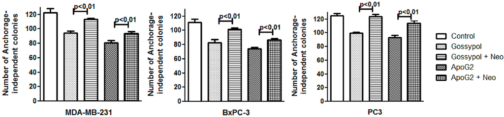 In vitro tumorigenecity assay or anchorage-independent clonogenic assay is done to identify the ability of a single cell culture in a three-dimensional environment devoid of attachment to form a multicellular colony. The assay is a method of choice to determine the tumorigenic/reproductive ability of a cell during treatment with a cytotoxic agent. As shown in Figure 4, treatment of cancer cell lines MDA-MB-231, BxPC3 and PC3 with gossypol and ApoG2 resulted in a decrease of anchorage-dependent colonies. However, the treatment of cells with gossypol/ApoG2 in presence of neocuproine leads to a significant increase in the number of colonies; again suggesting the role of copper in gossypol and ApoG2 induced cell growth inhibition.