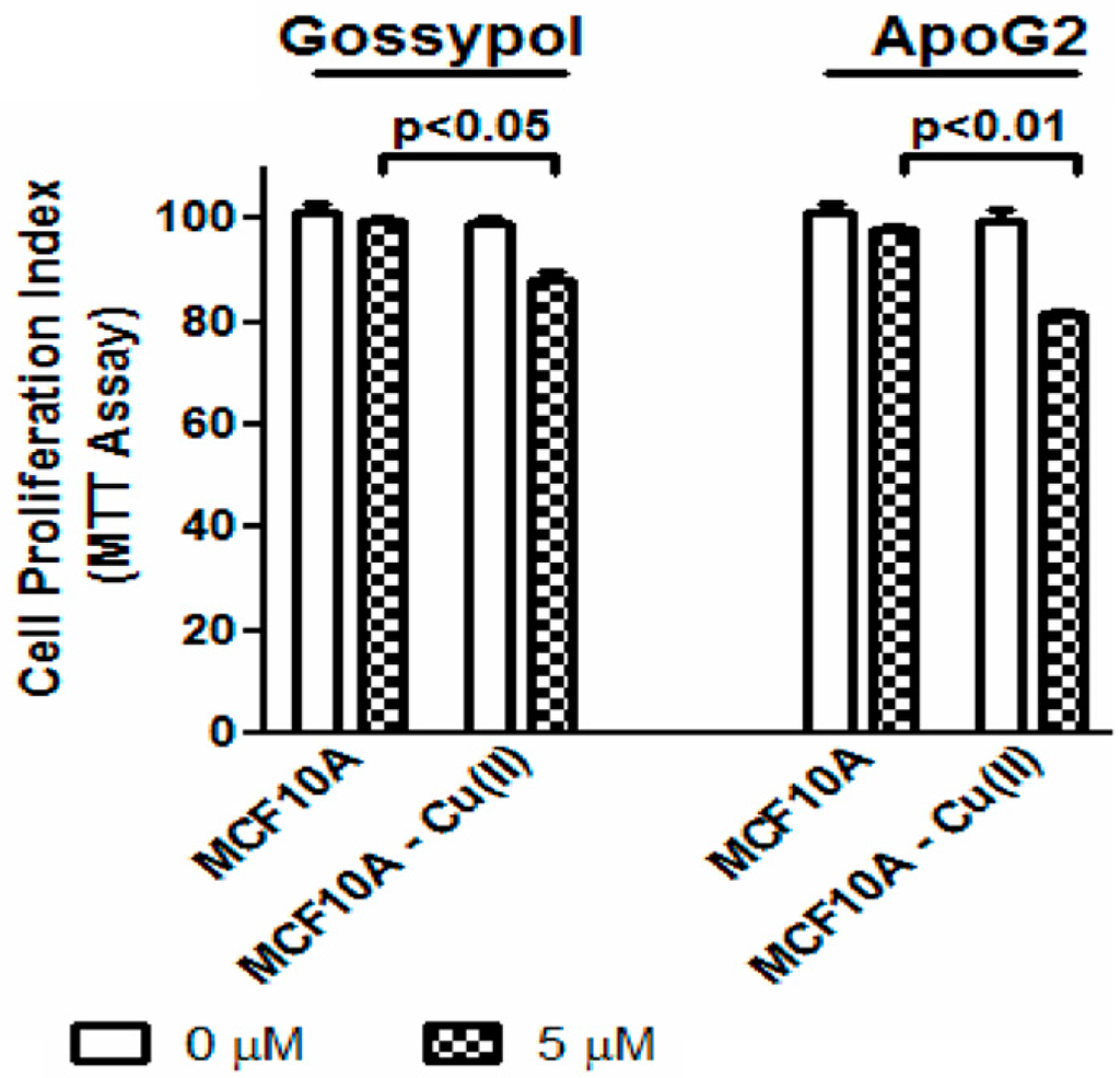 Normal breast epithelial MCF10A cells, which are known to have low levels of copper, were cultured in media supplemented with CuCl2 (copper supplemented cells are designated as MCF10A-Cu) and then treated with gossypol and ApoG2. Although copper itself is known to be cytotoxic at higher concentrations, Figure 5 indicates no significant difference in cell proliferation of MCF10A and MCF10A-Cu cells. However, when the MCF10A and MCF10A-Cu were treated with the test compounds, a significant inhibition in cell growth of MCF10A-Cu cells was seen; thus suggesting that supplementation of copper resulted in increased sensitivity and cytotoxicity of the normal MCF10A cells against these test agents. This further confirms the idea that the anticancer activity of these compounds is mediated by copper.
