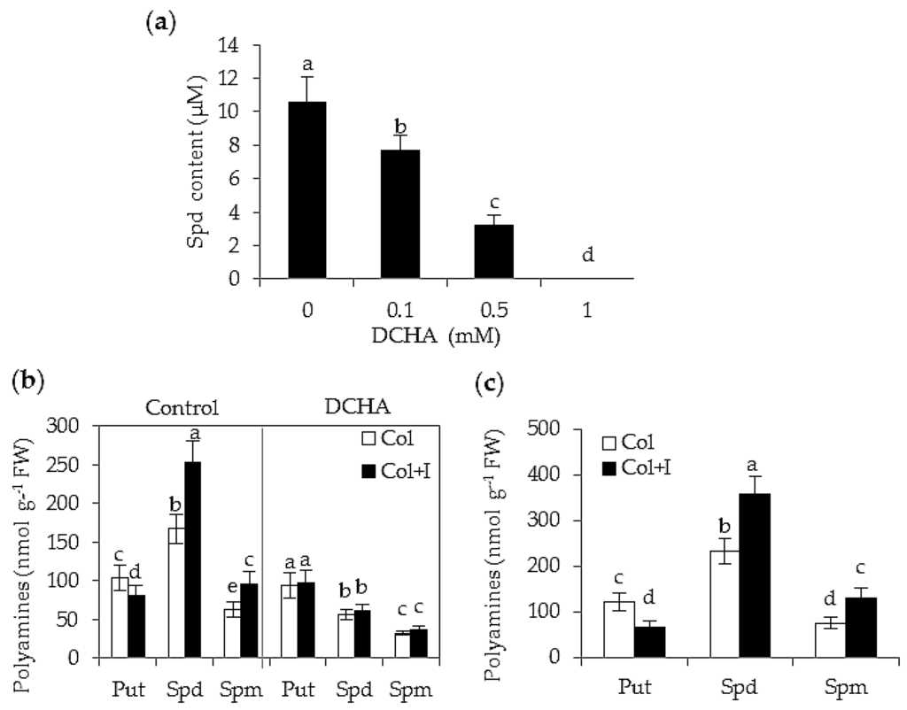 Determination of polyamines in the culture filtrates of BOFC15 and Arabidopsis plants. (a) Analysis of bacterial spermidine (Spd) under different concentrations of dicyclohexylamine (DCHA) (0, 0.1, 0.5 or 1 mM); (b) quantification of free polyamines (PAs) content of host plants grown in Murashige and Skoog (MS) agar medium with or without 1 mM DCHA after 5 d of BOFC15 treatments; and (c) quantification of polyamines (PAs) content of host plants grown in soils after 10 d of BOFC15 treatments. Col, control plants; I, inoculation with BOFC15; Col + I, inoculated plants; FW, fresh weight; Spd, spermidine; Spm, spermine; Put, putrescine; different lowercase letters above the bars represent significant difference at p < 0.05.