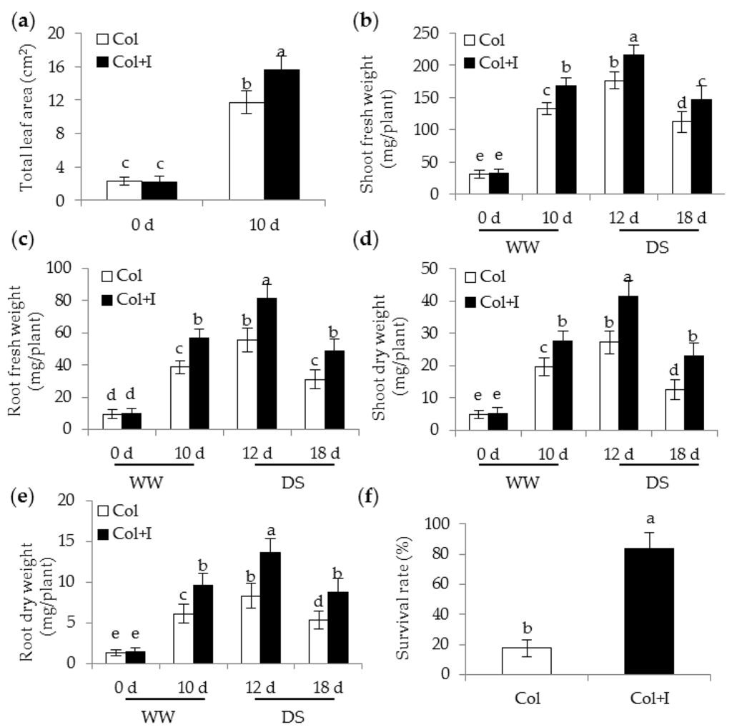 Inoculation with BOFC15 improved plant growth under well-watered (WW) and drought stress (DS) conditions. These plants were subjected to drought treatments for 12 and 18 d, respectively. Then, these plants were selected to analyze (a) total leaf area; (b) shoot fresh weight; (c) root fresh weight; (d) shoot dry weight; (e) root dry weight; and (f) survival rate. Col, control plants. Col + I, inoculated plants; different lowercase letters above the bars represent significant difference at p < 0.05.