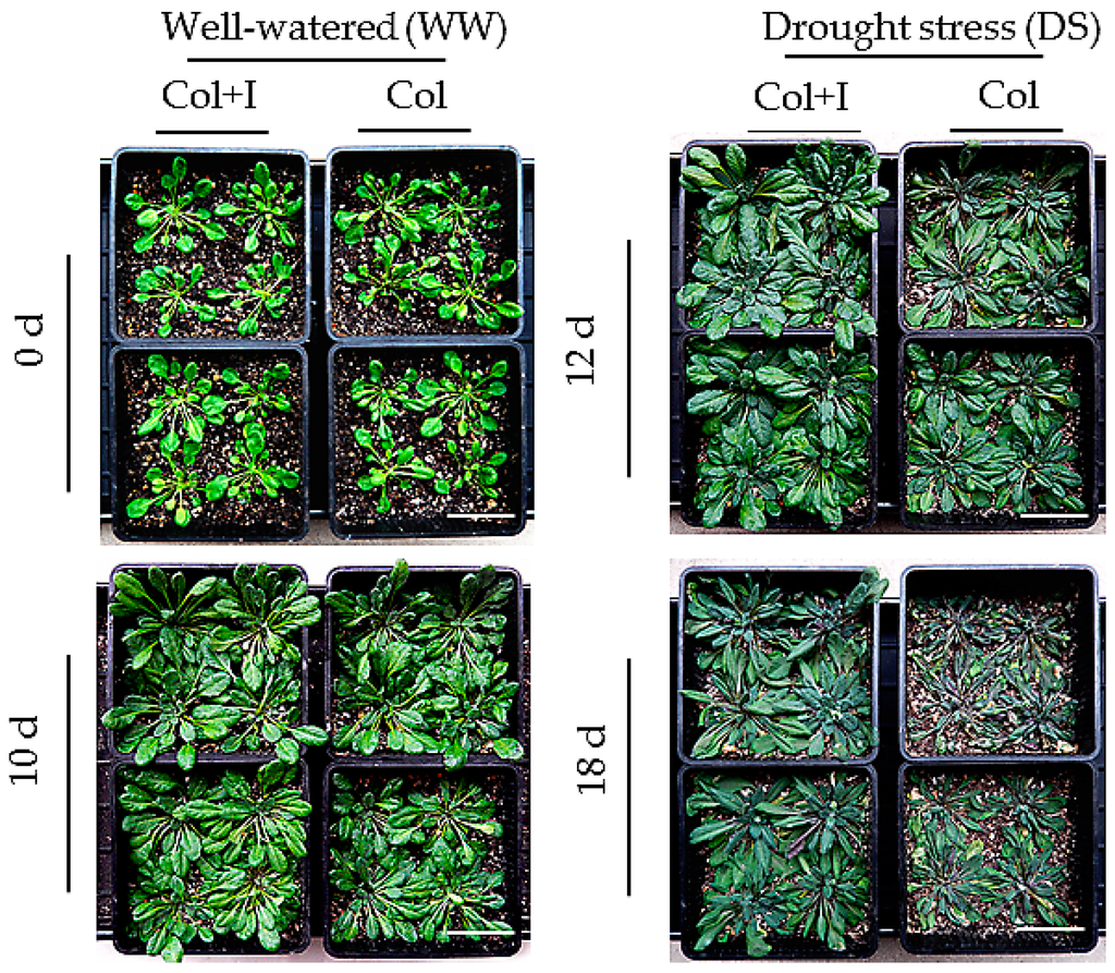 B. megaterium strain BOFC15 was isolated from cultivated wheat plants and identified by 16S rDNA sequencing (Genebank No. KU851253). This bacterial strain was maintained on half-strength MS solid medium with 2% sucrose and 0.8% agar. For bacterial inoculation experiments, BOFC15 was streamed into liquid nutrient medium and cultured in an orbital shaker (160 rpm) at 37 °C for 16 h. The bacteria were then collected through centrifugation at 6000× g for 15 min at 4 °C. Then, the precipitates were washed and diluted to an OD600 nm absorbance of 0.1 with sterile phosphate-buffered solution. The roots of 12-day-old seedlings were inoculated with 5 μL of bacterial diluent and placed on vertical MS agar plates. Furthermore, 1 mL of bacterial diluent was injected into the vicinity of the roots of each plant grown in soils. For drought treatments, the control and inoculated plants were regularly watered for 10 d and were subjected to progressive drought by withholding water irrigation for up to 18 d.