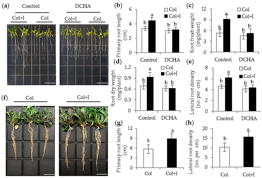 Inoculation with BOFC15 promoted plant root growth. 12-day-old Arabidopsis plants grown on MS agar medium were inoculated with BOFC15, and were then co-cultured for 6 d. Control, MS medium; DCHA, MS medium with 1 mM DCHA. These plants were selected to analyze several physiological parameters. (a) Phenotypes of plants grown in MS agar medium with or without DCHA; (b) primary root length; (c) root fresh weight; (d) root dry weight; (e) lateral root density; (f) phenotypic traits; (g) primary root length; and (h) lateral root density were examined in 22-day-old control (Col) and inoculated plants (Col + I) grown in soils; different lowercase letters above the bars represent significant difference at p < 0.05. Scale bars = 2 cm.