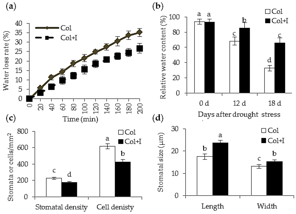 Inoculation with BOFC15 affected leaf water status under drought stress. 22-day-old Arabidopsis plants were subjected to water deprivation for 12 and 18 d, respectively. (a) Rosette leaves were detached from 22-day-old control (Col) and inoculated (Col + I) plants to monitor water loss rate; (b) rosette leaves from the control and inoculated plants under drought stress for 12 and 18 d were sampled to detect relative water content; In addition, the stomatal or cell density (c) and stomatal size (d) was measured in leaves of the control and inoculated plants; different lowercase letters above the bars represent significant difference at p < 0.05.